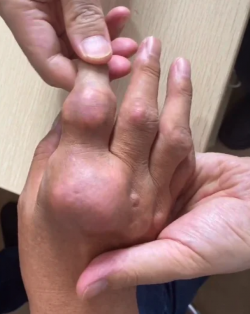 37岁的杨先生年纪轻轻却有着10年之久的痛风史,10年前痛风发作,症状反复,间断服用药物缓解症状,并未规律治疗。杨先生说:“吃了止痛药效果挺好的,一下就不疼了。”自那开始,每当痛风发作杨先生就吃止痛药解决,十年期间里手关节开始逐渐变形,看着关节处变形,杨先生在网上了解到这可能是痛风石,他不得已去当地的人民医院希望接受治疗。但令人没想到的是,除了痛风石之外还检查出了肾衰竭!