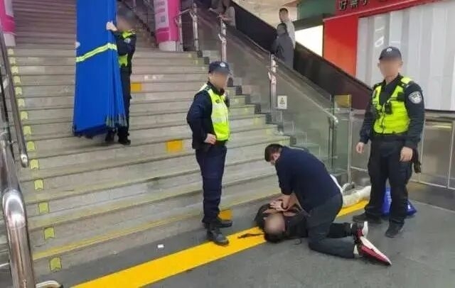 晚23时许,一名独自出行的中年男性乘客在口岸区域突然晕倒。在乘客倒下的1分钟内,危急时刻,保安员迅速到场,在呼唤乘客无意识后,立即使用对讲机呼叫物业值班人员和民警到场。