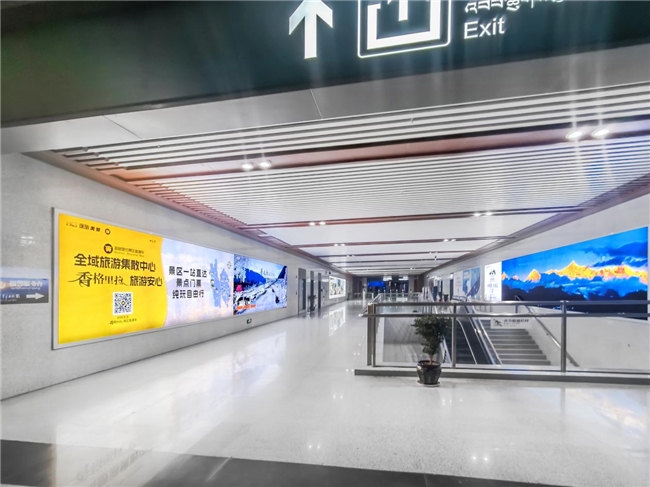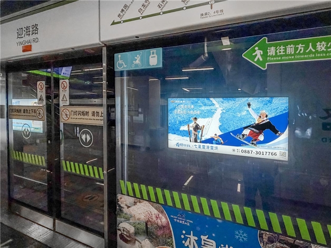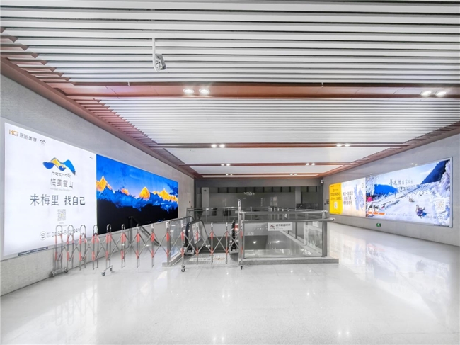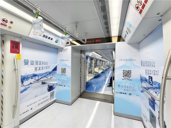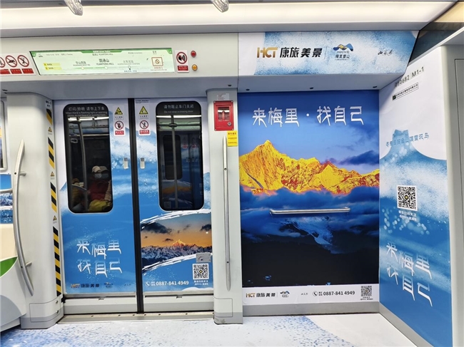 整列地铁车厢被“冬游迪庆-畅享冰雪”主题元素全方位包裹,从地板、车窗到车厢内壁,一幅幅精心挑选的宣传画面生动鲜活,将香格里拉的冬日盛景与独特风情原汁原味地呈现出来。与此同时,沿线的华山西路、福海、渔户村、迎海路、滇池国际会展中心等核心站点,也同步设置了冰雪主题宣传专区,广告信息全面覆盖昆明文旅地标区域及城市文化名片,让往来市民与游客在通勤、出行途中,便能沉浸式邂逅高原秘境的美好。