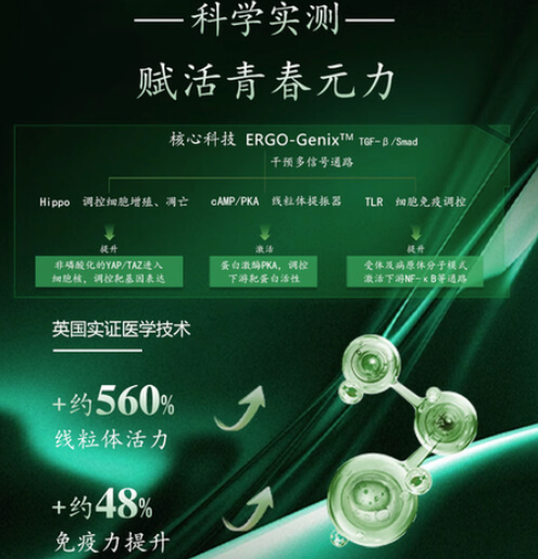 「牛津6代」的核心竞争力,在于其区别于单一作用点的系统化技术方案。它以独家专研的 “ERGO-Genix御老因子” 为核心,并科学复配了“AGTs Booster元气因子” ,两者协同形成了一套多维度、多通路的作用体系。