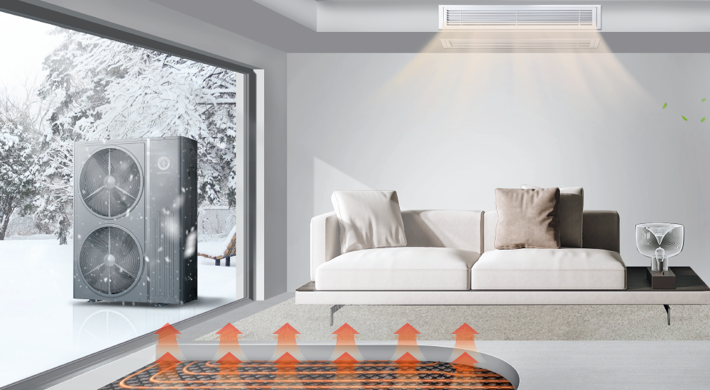 而空气能热泵专为采暖而生。它主要通过水系统来供暖(如地暖或暖气片),特别是地暖,能让温暖从脚底升起,均匀遍布整个房间,没有风感,毫不干燥。即使房屋空间大,一套功率匹配的主机也能轻松带动,实现全屋恒温,体感远比空调舒适。