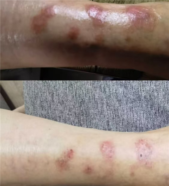 剖宫产术后六天,伤口外观红肿,有血性渗出液,瘢痕周围颜色暗红,产妇自述疼痛感强烈。应用普莱姿等离子体精华素7天,红肿消退,血性渗出液已吸收,伤口周围颜色基本恢复到正常水平。