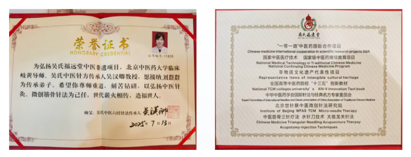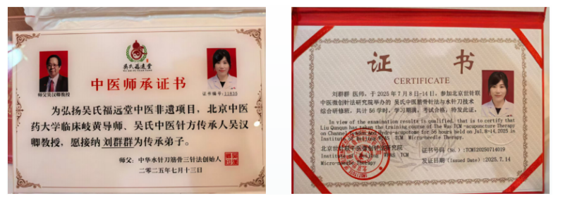 刘群群深知学海无涯,始终保持旺盛的求知欲。2025年7月,刘群群迎来专业成长的又一重要节点——正式拜师吴氏中医针法第五代传承人、中医筋骨针法与水针刀疗法发明人、北京中医药大学岐黄导师吴汉卿教授,成为其传承弟子。为了精进技艺,她还参加了北京世针联中医微创针法研究院举办的“吴氏中医筋骨针法与水针刀技术综合研修班”,不断完善知识体系。此次深造,让她将水针刀、筋骨针法融入自身诊疗体系,进一步拓展了在颈肩腰腿痛、头晕头痛、神经痛等痛症治疗上的维度,实现了“埋线+特色针法”的技术融合。