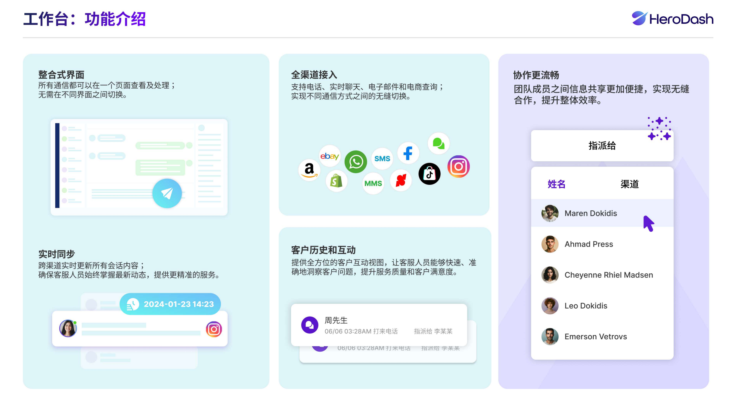 HeroDash全渠道工作台具有众多突出的特点。首先,它实现了一站式处理所有渠道消息。所有通信都可以在一个页面查看及处理,告别了不同界面之间切换的繁琐操作,让客服人员能够更加专注地处理客户问题。其次,实时同步功能确保永远掌握新动态。跨渠道会话内容实时更新,确保每位客服人员看到的都是新信息,提供更精准、连贯的服务体验。再者,全渠道无缝接入与切换也是其一大亮点。无论是电话、邮件、在线聊天、短信、Facebook Message、WhatsApp Business、Instagram DM等,都能在同一界面平滑处理,实现不同通信方式间的无缝衔接。后,完整的客户历史与互动视图功能,系统自动整合每位客户的全渠道互动记录,提供的客户视图,让客服人员快速洞察问题根源,显著提升服务质量和客户满意度。