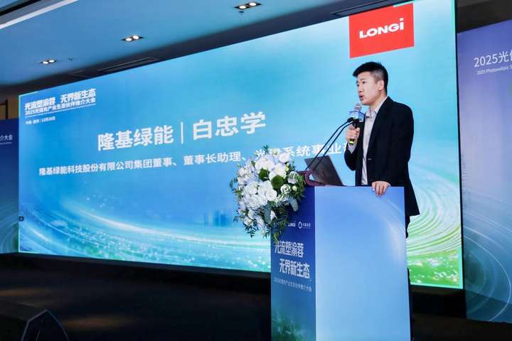 大会伊始,隆基绿能科技股份有限公司集团董事、董事长助理、光建系统事业部总裁白忠学先生发表致辞。他指出,光伏行业正迈入发展新阶段,隆基绿能始终坚持“技术创新驱动高质量发展”,以BC电池技术构筑差异化核心竞争力,深耕建筑光伏一体化领域。未来,将携手合作伙伴,推动高效组件与光储解决方案在多元场景的规模化落地应用,助力区域低碳转型,共筑绿色发展新生态。
