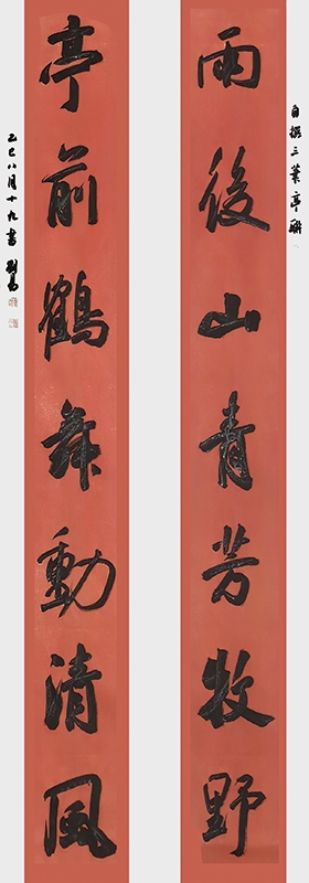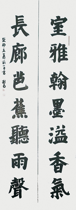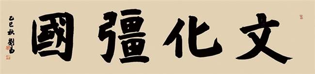 刘易的书法作品不仅是笔墨技巧的展示,更是文化精神的载体。他的作品内容多取材于经典诗文、名言警句,通过书法的形式将其中蕴含的哲理与情感传递给观者。如“文化强国”的榜书作品,以雄浑的笔力、开阔的气势,表达了对国家文化繁荣的殷切期盼;“室雅翰墨溢香气,长廊芭蕉听雨声”的对联,则营造出一种宁静雅致的文化氛围,让人感受到传统文化的魅力。他的书法作品在传递艺术美的同时,也肩负着传承文化、弘扬精神的使命
