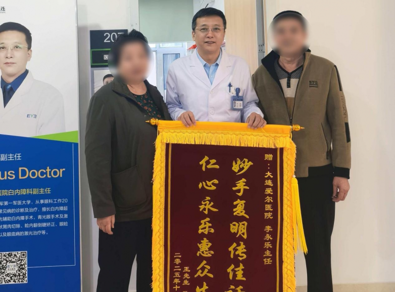 为表达对李永乐主任及大连爱尔眼科医院医护团队的由衷感谢,王先生亲自题写一面锦旗送至医院。锦旗上苍劲有力的两行字——“妙手复明传佳话,仁心永乐惠众生”,既巧妙地嵌入了李永乐主任的名字,也真挚地赞誉其精湛医术与高尚医德,成为这段医患佳话的最佳见证。