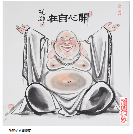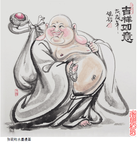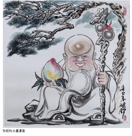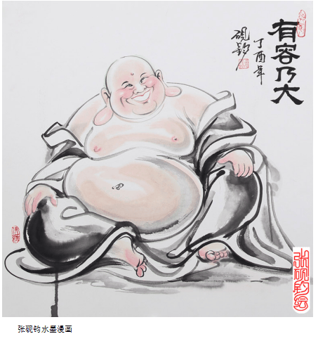 以中传统的水墨画工具笔墨纸砚,创作的却是风趣幽默的漫画造型,又是张砚钧先生的另一种绘画特色,即水墨漫画。传统中渗透着了新意,老道厚重的笔墨中又不失活泼和轻松!既有酣畅淋漓的泼墨染色,又有娓婉细腻的线条勾勒。刚柔并济,线面组合,墨色交融,骨肉俱全,很有韵律感与节奏感,给人以自然、率真的艺术享受。希望张砚钧在今后的艺术道路上走得更稳、更远,多出佳作,以飨读者。