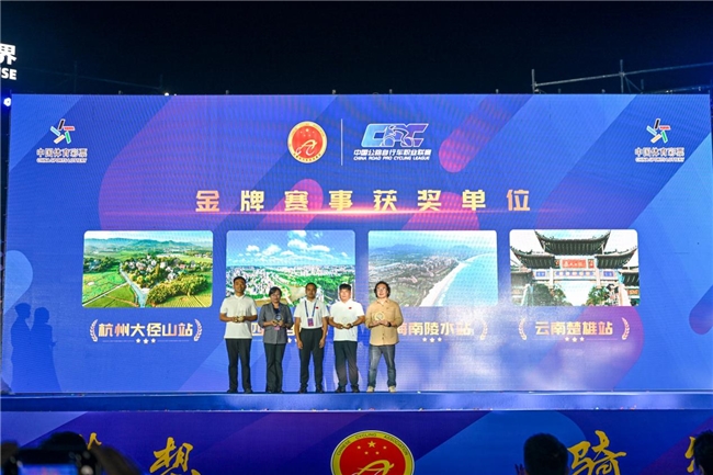 盛典现场,年度特色奖项与竞技荣誉逐一揭晓。获得特色承办奖项获奖单位共计11个,杭州大径山站(体旅融合典范奖)、天津静海站(卓越赛事组织奖)、吉林查干湖站(生态共荣发展奖)、乐清雁荡山站(生态体验提升奖)、四川自贡站(城市骑行活力奖)分别获得各项殊荣。云南丽江、大理、楚雄、玉溪、昆明依次获得“玉龙高原样板奖”“高原竞速卓越奖”“全民骑行推广奖”“自然与人文和谐奖”“现代都市先锋奖”。总决赛海南陵水站获得“山海生态标杆奖”。
