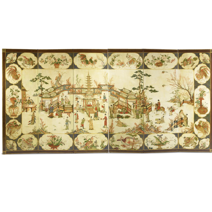从 Chinoiserie 的角度看,这件意大利屏风最具意义之处,在于它将东方视觉母题纳入十八世纪欧洲装饰体系的结构逻辑之中。庭院主景以规则分格的建筑与台阶构成几何化架构,边框开光则如同连续的“图像徽章”,在整体上形成严密的装饰秩序:每一块画面既是独立的装饰单元,又服从于屏风整体的节奏与对称关系。这种通过分格、框饰和图案重复来组织东方意象的方式,正体现了西方装饰艺术对结构性和陈列性的追求。东方世界在此不再是一个真实的地理空间,而是一套被规整为“可装饰”的视觉语言——既保留了亭台、山水、人物、禽鸟的诗性符号,又被纳入欧洲室内陈设与贵族生活的审美秩序之内,成为十八世纪 Chinoiserie 在跨文化想象与装饰制度之间运作的典型例证。