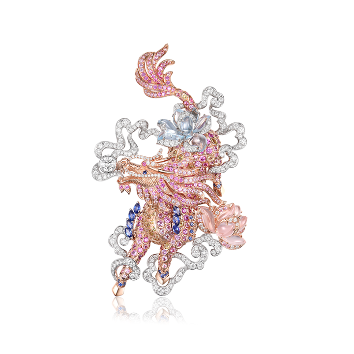 再以Chinoiserie风格珠宝的最佳代表储粹宫CHUCUI PALACE的作品“云悦麟熙 Kirin in Clouds”为例,作品构图以腾跃的麒麟为主体,周身环绕以缭绕云纹,形成一种被托举、由流动线势贯穿的视觉格局。主体形象在姿态上呈现出上升、舒展的动态,使观者的视线被引导至作品顶部的飘逸纹饰,构成自下而上的呼吸节奏。云纹以镂空组织空间,穿插其间,使瑞兽在虚与实、密与疏之间获得具有东方韵致的浮游感。这种构图方式,是典型的 Chinoiserie 对东方传统图像语法的吸纳:以形制承载灵性,以姿态延续寓意,通过结构上的轻盈与通透,构建介于现实与想象之间的视觉场域。