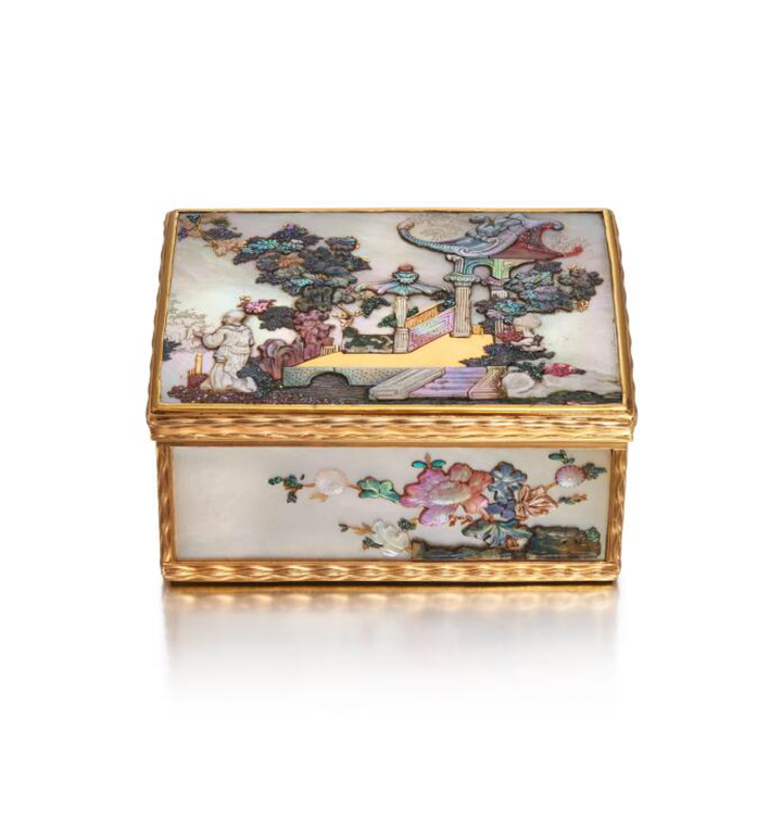 这件鼻烟盒最具价值的审美之处在于,它呈现了东方视觉母题如何在 Chinoiserie 中被重新编码:东方美学中的“片段式自然”“移步换景”“意象生长”被转为可掌控的装饰逻辑。贝壳叠光模拟东方绘画中“空灵、透亮”的留白氛围,折枝花与亭台则成为可自由排布的构成单元;人物与场景被赋予象征性而非叙事性的存在,使画面既保留东方诗意,又融入欧洲晚期装饰艺术的结构感。在这件作品中,东方的视觉语言成为激发装饰秩序的动力,而 Chinoiserie 的形式系统则为这些意象提供了新的呈现方式,两者由此形成一种共生的审美空间,使器物既具“东方的意味流动”,又具“欧洲的构图理性”。