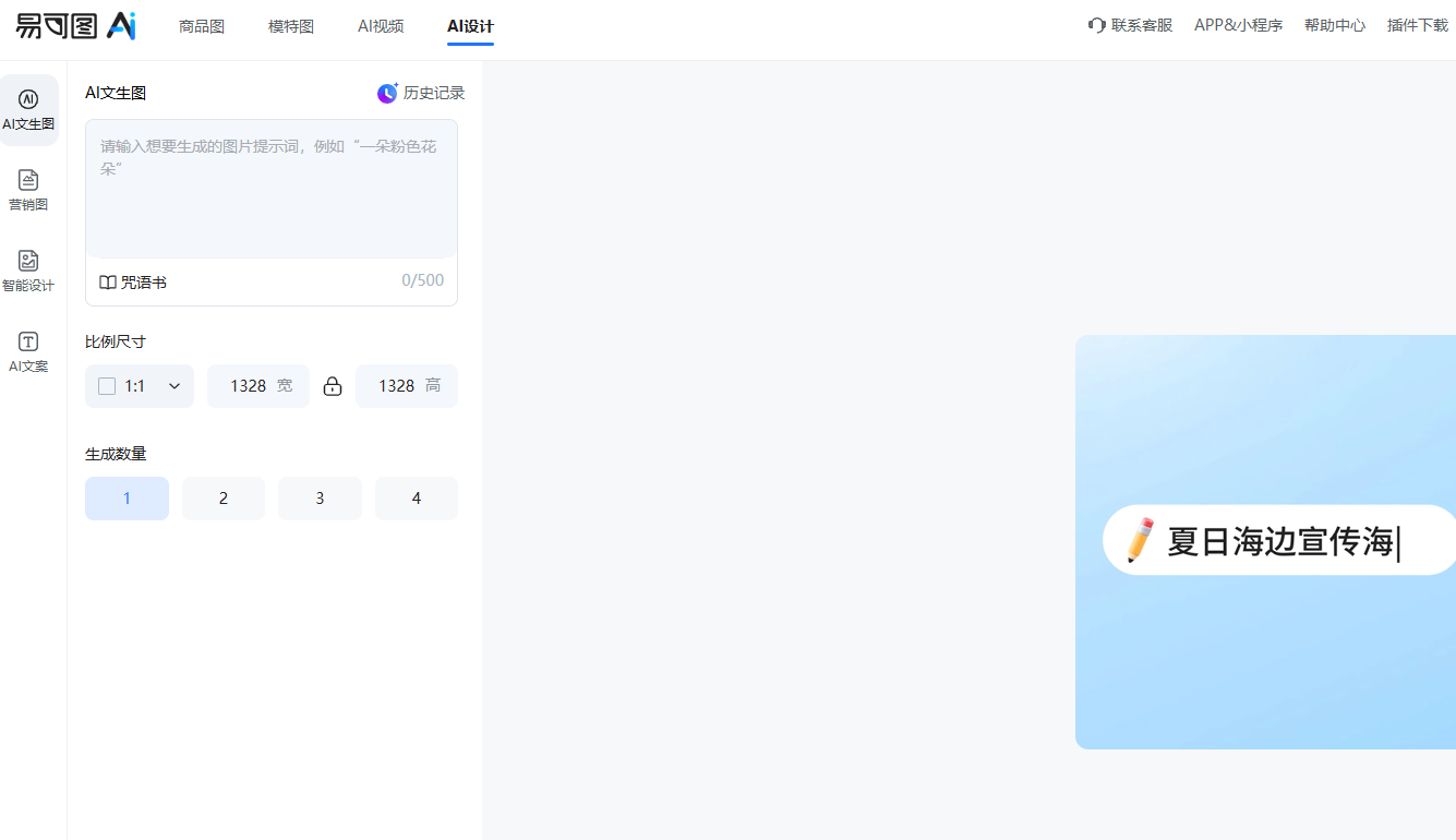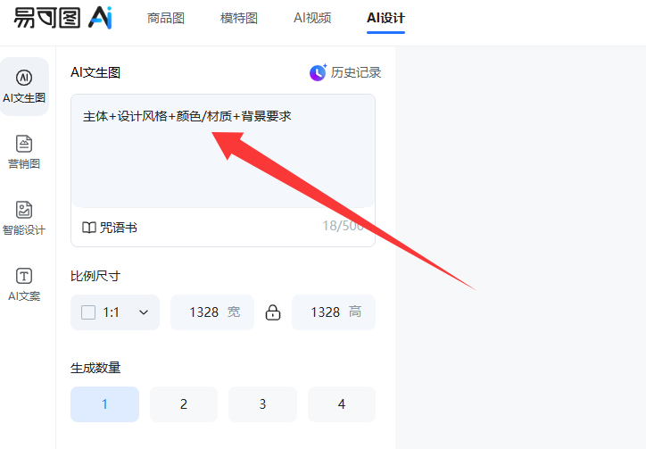 我们先进入易可图AI文生图功能,然后在这里进行创作前需要思考一下3个问题:你的品牌名字是什么?你是做哪个行业的?你想做成什么风格(简约风、复古风、卡通风还是科技感)?