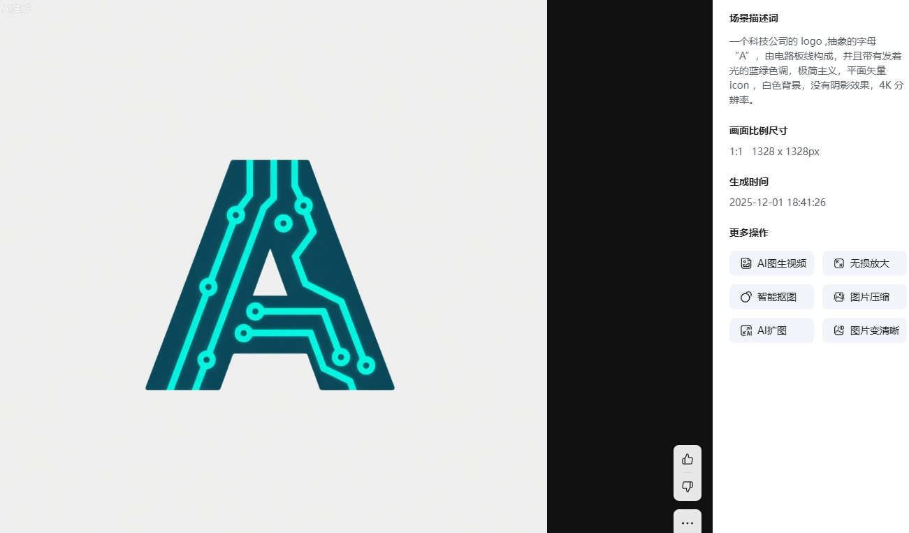 提示词参考:“一个科技公司的 logo ,抽象的字母“A”,由电路板线构成,并且带有发着光的蓝绿色调,极简主义,平面矢量 icon ,白色背景,没有阴影效果,4K 分辨率。”