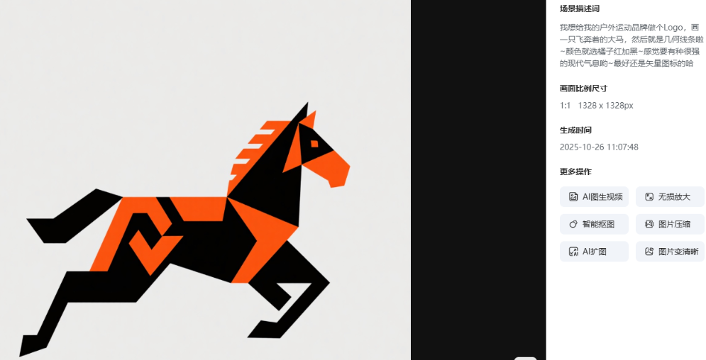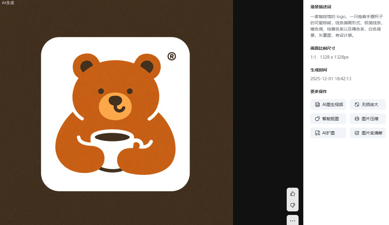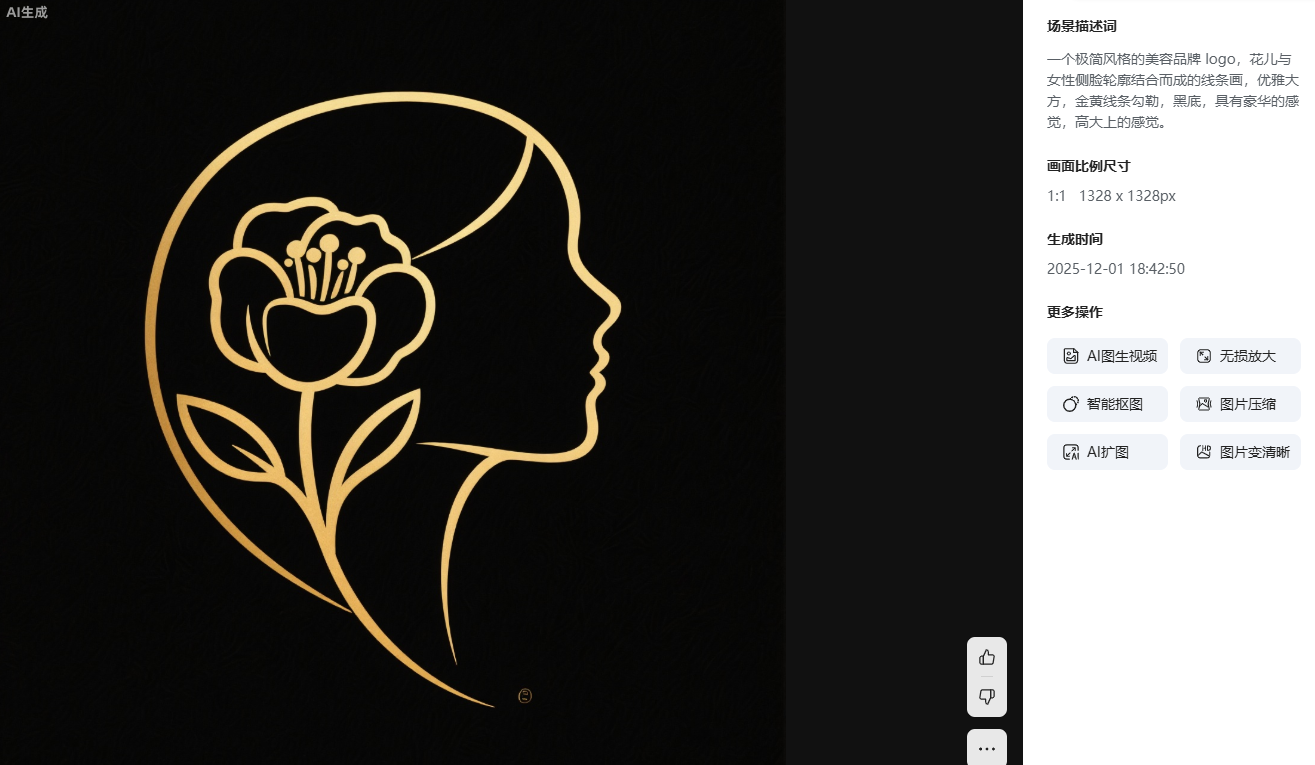 提示词输完后,选择合适的画面比例(Logo通常推荐1:1),然后点击生成就可以了。