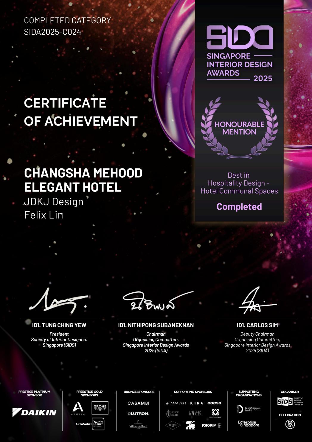 ▲湖南·长沙五一广场雅致酒店荣获2025新加坡室内设计奖(SIDA)提名奖