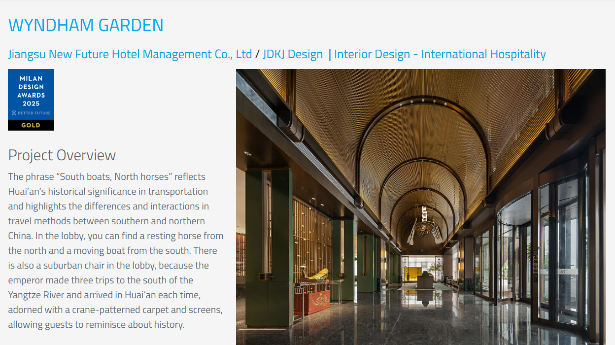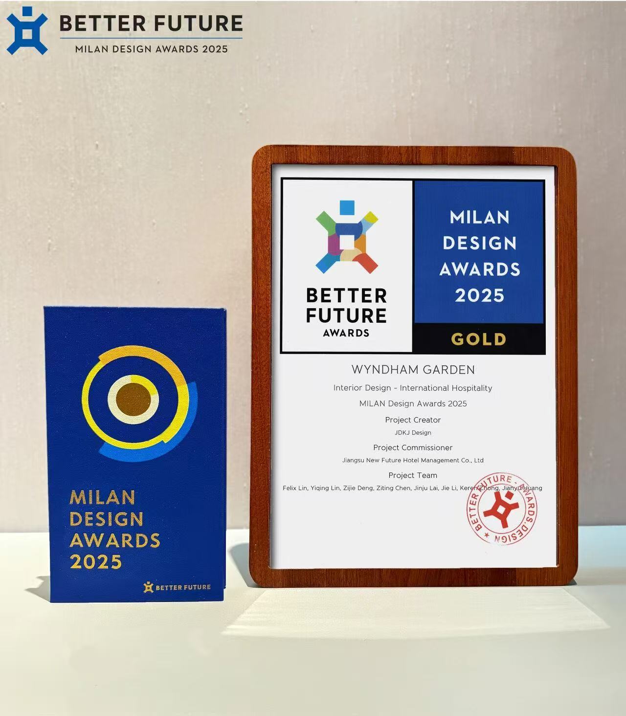 ▲淮安·温德姆花园酒店荣获2025米兰设计金奖&证书