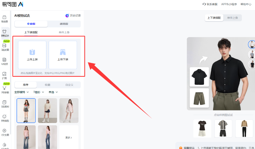 第一步:上传服装图。进入易可图AI模特试衣的功能页面后,点击上传按钮即可完成服装图片的上传工作。对于上传到系统中的服装图片要求为正面平铺、清晰度。