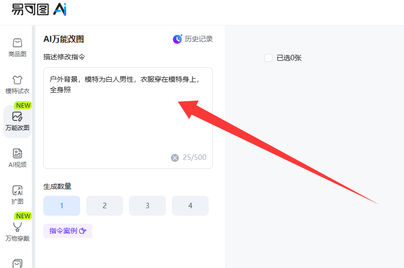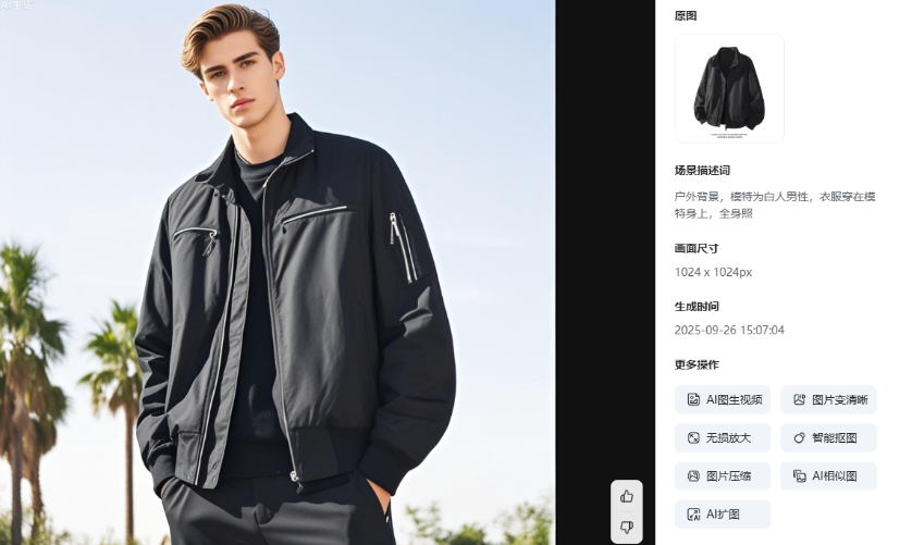 您可以上传服装图,在指令框里写下想要进行的更改内容,例如,“户外场景、白色皮肤男性、穿上衣服的全身照”,AI会根据你的说明进行相应的处理,并最终完成你所希望得到的效果图。