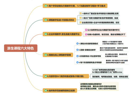 转行的人最怕什么?怕没方向,怕花了时间却不对口。涤生在教学上是定制化的。入学前,会根据学员的学历、工作年限、目标薪资、城市和技术基础储备,量身定制学习方案。不是所有人都要把整个大数据生态系统从头到尾“过一遍”,而是根据你的目标告诉你:哪些是必须掌握的,哪些只要理解即可。这样,小白也能清楚知道自己该往哪里走。
