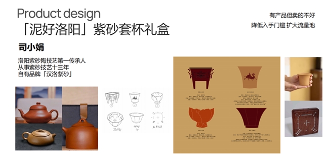 洛阳紫砂技艺传承人司小娟的产品痛点是成本高入手门槛高的特点,雪莹老师给出了降低消费门槛,扩大流量池的产品改进目标建议。以洛阳古老文化底蕴为主的“你好洛阳”紫砂套杯礼盒诞生。
