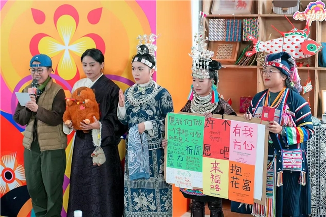 来自全国各地的非遗传承人携特色非遗技艺亮相,展现出非遗在新时代的创新活力与多元魅力。来自黑龙江漠河塔河县的鄂伦春族的郭爽带来了桦树皮雕刻技艺。她以天然桦树皮为原料,通过剪、刻、雕等手法,将鄂伦春族的狩猎文化、自然图腾融入作品,让这一古老技艺焕发现代生机。青海果洛州的拉尔吉则带来了藏族服饰与现代文创的融合产品,网红“土拨鼠”系列文创,将藏族传统纹样与时尚元素结合,全网销量突破5000件,成为非遗“破圈”典范。此外傣族金水漏印、徽州鱼灯、洛阳紫砂、苗族刺绣、蜡染、藏纸、藏文书法等技艺交织碰撞,展现出不同地域、不同民族非遗技艺的风采。