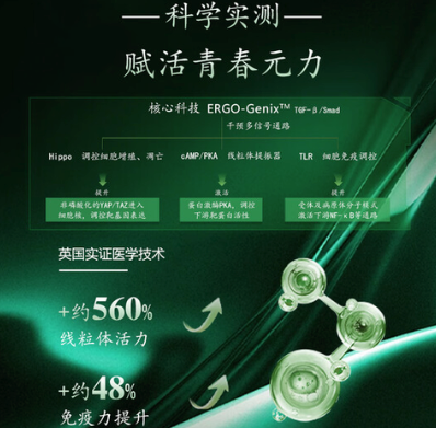 ERGO-Genix®御老因子:作为自主研发的核心技术载体,它承载了支持细胞功能、维持健康基础的主要设计目标。