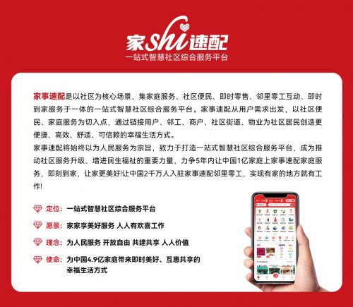 家事速配自创立以来,始终致力于通过数字化提升社区生活服务的便捷性与可靠性。平台以社区为核心场景,连接合规的服务提供者与广大家庭用户,以“家家享美好服务,人人有欢喜工作”美好企业愿景,打造一站式智慧社区综合服务平台。