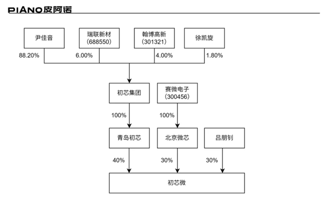 进一步看,青岛初芯的控股股东为初芯共创控股集团有限公司(以下简称“初芯集团”),分别由尹佳音以及两家A股上市公司瑞联新材(688550.SH)、翰博高新(301321.SZ)持有88.2%、6%、4%的股权。同时,创业板上市公司赛微电子(300456.SZ)全资控制的北京微芯持有初芯微30%股权,同样持有初芯微30%股权的吕朋钊为科创板上市公司瑞联新材前实控人吕浩平之子。