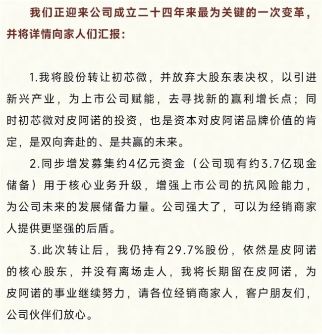 在《致全体皮阿诺家人的一封信》中,马礼斌承认,“将股份转让初芯微,并放弃大股东表决权,以引入新兴产业,为上市公司赋能,去寻找新的赢利增长点。”