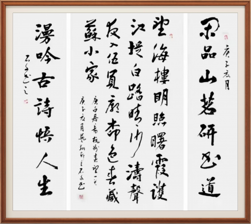 这种艺术追求在其2024年获得的"中国艺术百花奖"作品中达到新境界。同年创作的《古诗四条屏》《黄土情深》《金虎归山辞旧岁》《翘首回顾三十春》获得国家版权局登记,这一系列作品集中体现了他的艺术追求:将书法从二维平面解放出来,赋予其三度空间的文化意蕴。石文善于在作品中制造矛盾与和谐的对立统一枯润相济的墨色、动静相生的结体、虚实相间的章法,共同构成了充满张力的视觉场域