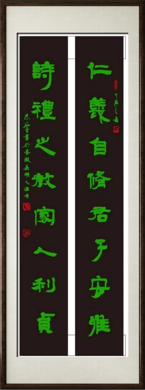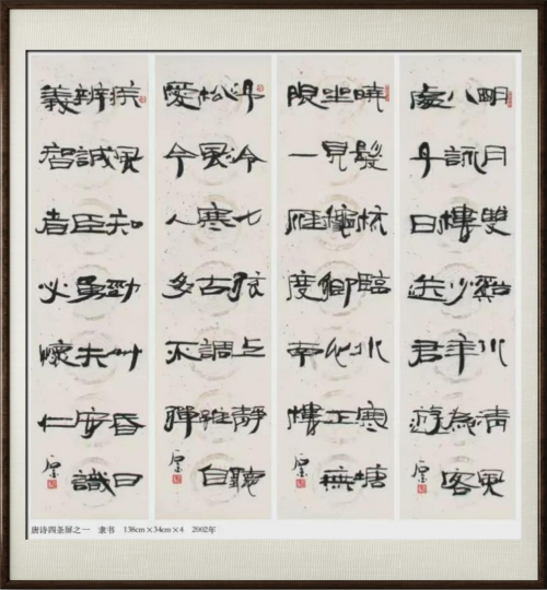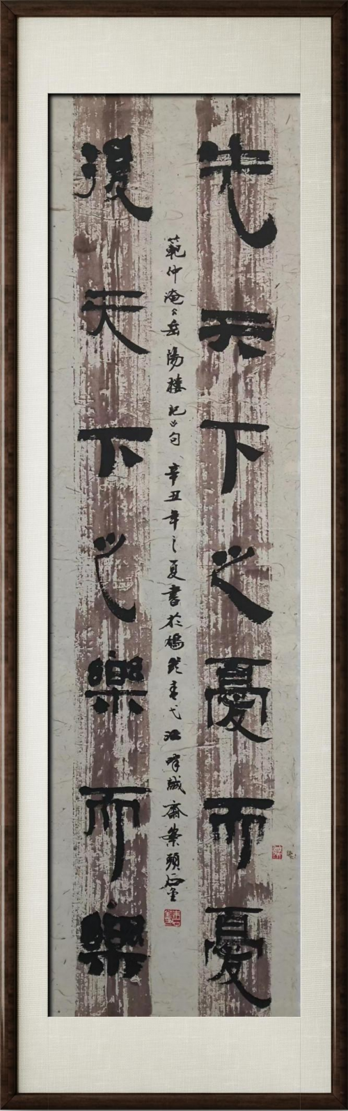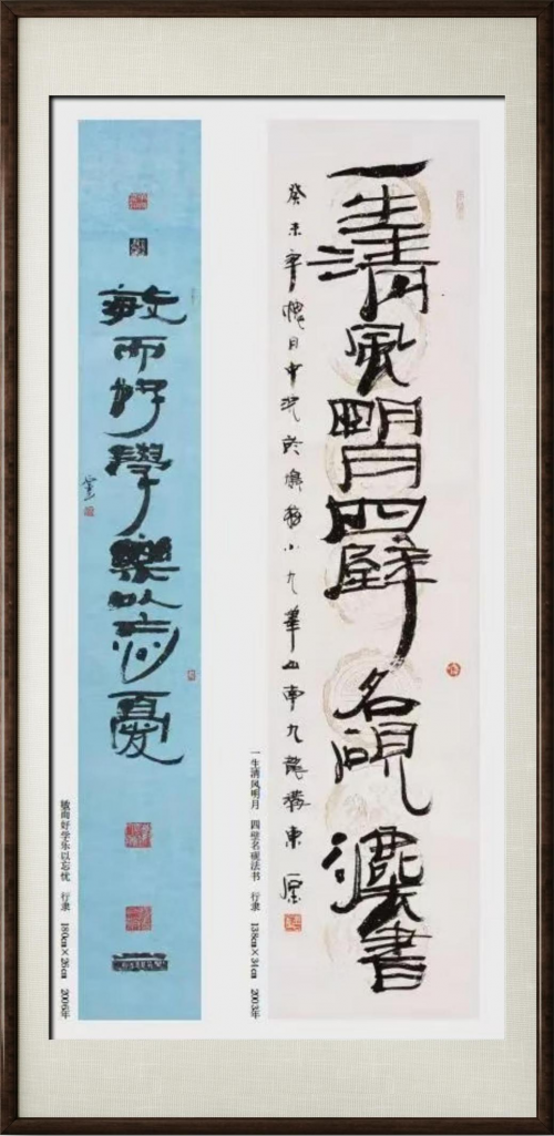 我欣赏石金先生的书法,大致缘于三个方面的原因:首先,我感觉先生的书法是用心和用情来写的,其书字字中宫紧凑、伸张得体,整篇布局贯气如虹、势韵豪气;其每一个字的点划之间,运笔自如,都是那样的和谐到位,每一幅作品的气与势的彰显都那么纯真豪放而却不露锋芒,让人感觉舒服的同时,又颇有震撼之力。其二,先生的书法既具二王之风,更具现代之韵,尤其是先生的隶书,揉以篆意,以竹简书求变化,形成一种篆隶简牍相融,笔走行书意韵的独特风格。在动与静的结合上、在变与不变的融合上,的确是见了功力的。不但极具拙朴厚重之感,而且不乏乐感般灵动俊逸。所谓的雄浑圆润也好、劲遒云逸也罢,都不足以形容先生的笔墨律感。第三,那便是先生书法作品的用墨之法颇具特点、极其讲究,浓淡适宜、轻重连意得体,是其最难能可贵处。这种分寸的把握,并不是每一个书法家都能做到并做好的。因此,先生之书既有古典名家之风,又具现代风流气息。正可谓走笔横笺行云中,洒墨抑扬锋芒雄。点勾尽看傲骨立,兼蓄柔情默弯躬。留白疏浅倾明月,展卷犹觉亮晴瞳。谁知春秋岁年里,心血汗滴露香凝!