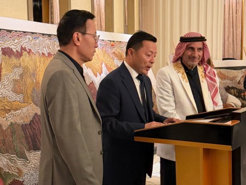 在充满国际氛围的剪彩仪式上,崔勇主任与阿联酋王室成员及其他各国嘉宾共同为画展揭幕。他在随后的致辞中表示,本次展出的余涵宇大师作品,深度融合了中国西藏雪域的磅礴气韵与江南水墨的空灵意境,不仅是个人艺术创作的巅峰呈现,更是古老丝绸之路文明对话在当代的生动回响。崔勇主任指出,在全球化深入发展的今天,不同文明之间的理解与欣赏,是构建人类命运共同体的重要人文基础。艺术无国界,文化可相通,正是这样的跨文化共鸣,为国际间在旅游、文化、健康等领域的务实合作铺设了情感与信任的桥梁。