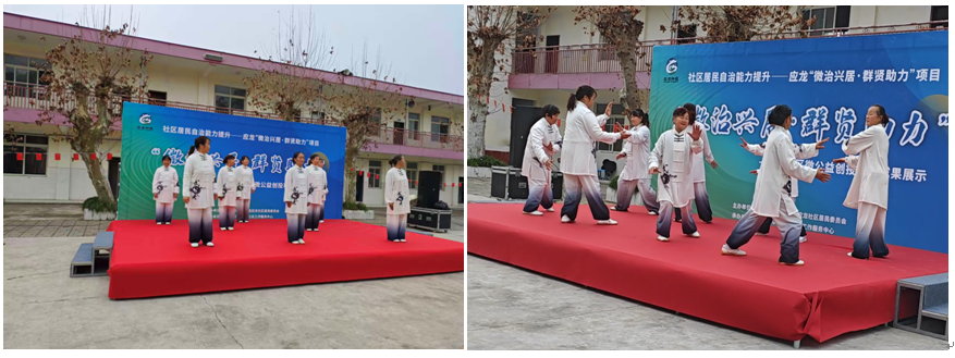 活动临近收尾之际,部分老年协会成员自愿参与、身着统一服装登台,自发带来太极拳 24 式展示。队员们动作舒展流畅、神情专注从容,将太极拳的刚柔并济与养生内涵展现得淋漓尽致,既彰显了社区老年群体主动参与社区活动的热情,也展现了健康向上的精神面貌,为活动增添了浓厚的文化氛围,引得现场居民纷纷拍照喝彩。