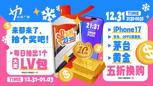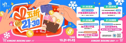 兴和集团再度创新消费体验,于2025年末焕新推出“21:30五折2.0”活动。从12月31日晚间开始,持续至新年1月3日,活动融合了力度空前的折扣、氛围热烈的现场音乐会以及每日不缺席的LV包抽奖,全心全力为顾客营造一个实惠与惊喜交织的购物节庆。
