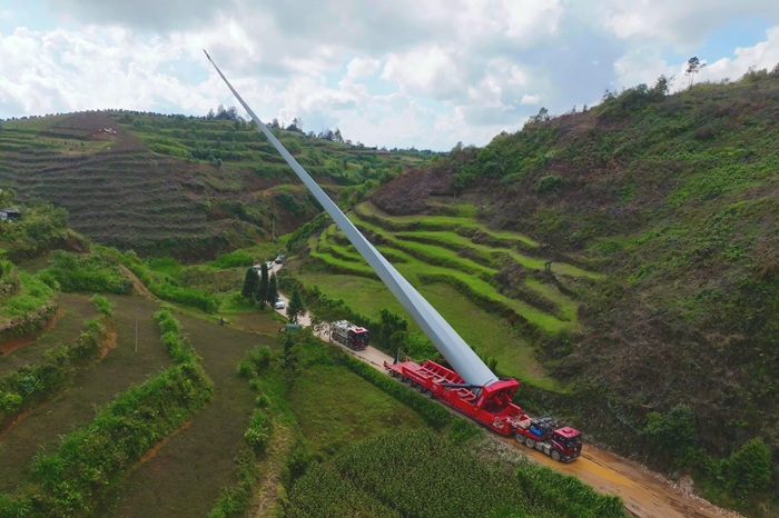 技术突破是项目攻坚的硬核支撑,作为云南首个10兆瓦大容量机组山地风电项目,面临大机组建设经验不足的行业难题,加之现场雨季绵长、极端天气频发、沿途高速塌方、叶片发运地大雪、山地道路狭窄崎岖等客观因素,风机大件运输面临严重考验。为妥善解决以上难题,项目迅速成立技术攻坚小组,反复踏勘优化运输路线、定制专项运输方案,破解山地大件运输瓶颈;针对雨季施工痛点,制定专项施工预案,定期巡视路段排查塌方、山体滑坡等突发情况,抢抓晴好窗口期高效推进基础浇筑、风机吊装作业,协调多地政府部门临时拆除障碍、加固路基。同时,借鉴行业先进经验,结合项目实际优化大机组安装调试工艺,成功补齐技术短板,实现施工质量与建设进度双提升。