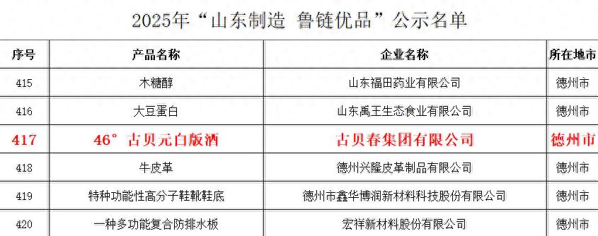 12月25日,山东省工业和信息化厅公布了2025年“山东制造·鲁链优品”名单,古贝春集团旗下产品“46度古贝元白版酒”成功入选。这是继荣获“中国创新典范产品”“山东制造·齐鲁精品”后的又一重要荣誉,体现了企业在“山东制造”高质量发展方面的持续发力。