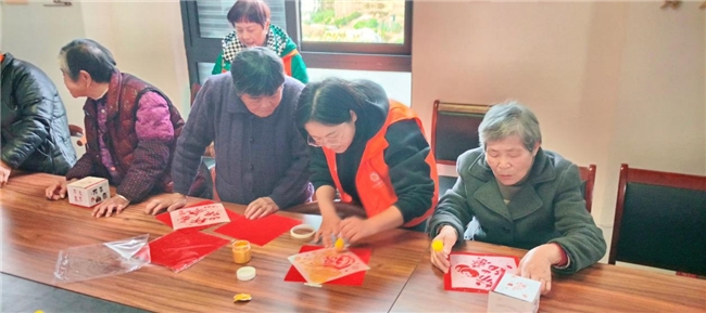 活动的最后环节是融合手工体验。大家一起剪窗花、体验非遗拓印,为新的一年增福增欢乐。