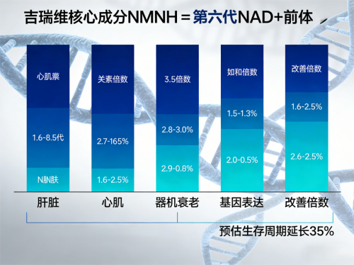 顶刊背书:发表于《Cell》的研究显示,相比前五代NAD+前体,吉瑞维核心成分NMNH组受试者的肝脏、心肌等器官衰老减慢速率达1.6-2.5倍。