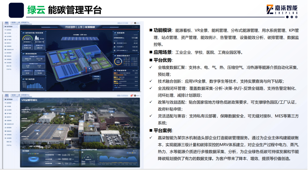 目前,该平台已在多个国家级工业园区落地,帮助客户实现综合能效提升20%以上,年减碳量超千吨,为工商业领域低碳转型提供了可复制、可推广的数字化解决方案。