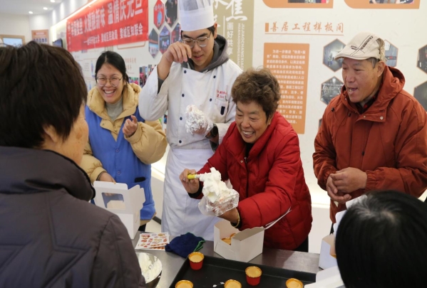 蛋糕制作区,欢笑声不断。来自烹饪专业的志愿者化身指导师,细致拆解火腿蛋糕制作流程。从火腿馅料的预处理秘诀,到咸香火腿丁与奶油、坚果的黄金配比……大家互相协作、分享技巧,当一个个造型别致的蛋糕完成时,每个人的脸上都洋溢着幸福的笑容。李阿姨拿着自己做的蛋糕道:“我们的生活就像这蛋糕一样香甜!”。趣味的活动让大家感受到了浓浓的邻里情和节日的味道。”