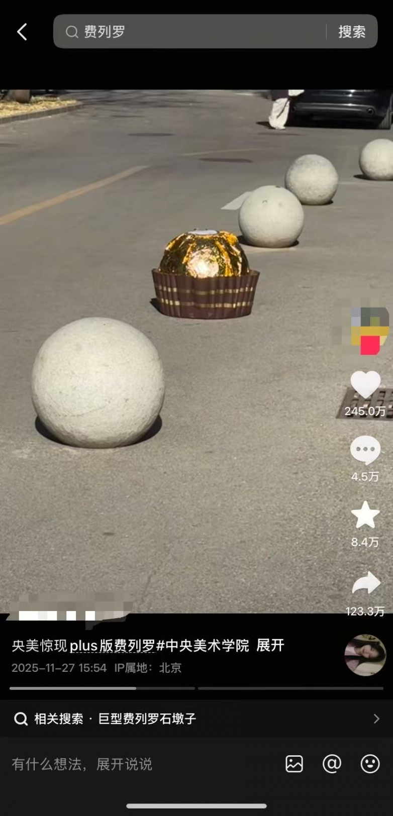 此前,费列罗标志性的 “金色球” 形象早已深入人心,但品牌与消费者的互动,长期以来更多聚焦于静态的广告投放与货架陈列场景。这一现象的改变始于一次意外的“碰撞”。当网友发现央美石墩子神似费列罗经典外观,自发 DIY 金色包装引发全网趣味玩梗与热议后,品牌在运营服务商视说物语的协同下,快速以幽默平等的姿态在评论区与用户“玩在一起”,并顺应呼声将“梗”转化为一场全民参与的抽奖活动与二次创作征集。