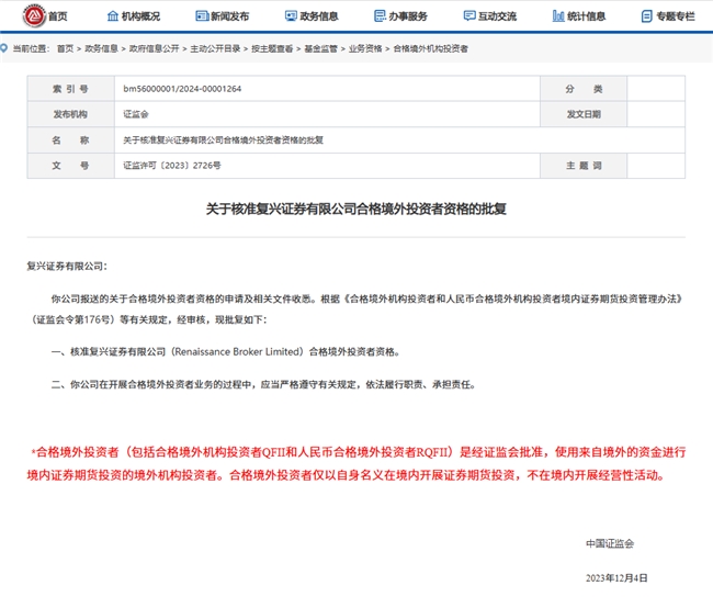 “QFII资格审批本质上是对机构综合实力的全面考察,包括合规水平、资本实力、专业能力等多重维度。”业内人士分析,复兴证券能够快速通过审核,关键在于其各项指标均达到甚至超过监管要求,形成了“合规无瑕疵、资质全覆盖、专业够硬核”的综合优势。