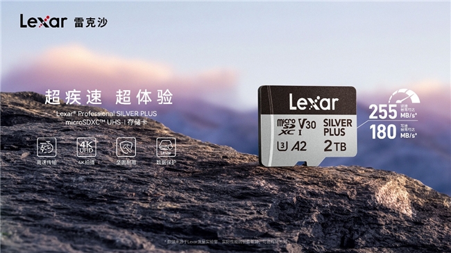 而在专业影像领域,雷克沙再次刷新了行业上限。全新发布的Lexar Professional SILVER PLUS microSD卡,不仅是全球首款2TB容量的UHS-I microSD卡,更实现了255MB/s的读取速度与180MB/s的写入速度 。这款产品不仅适配高端无人机和运动相机,更完美支持4K 60帧高清视频录制,是大疆等专业设备厂商推荐的得力助手 。