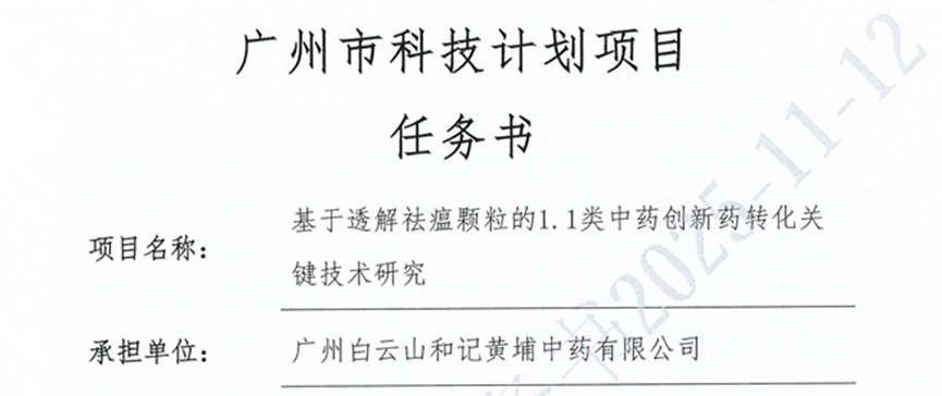 近日,广州白云山和记黄埔中药有限公司(以下简称 “白云山和黄中药”)官宣重磅喜讯:由其牵头承担的 “基于透解祛瘟颗粒的 1.1 类中药创新药转化关键技术研究” 项目,成功入选 2025 年度广州市重点研发计划立项名单,并斩获市级财政专项资助。此次立项标志着该项目的研究方案、技术路径与应用价值已获官方权威认可,为中医药产业高质量发展注入强劲政策与资金动能。
