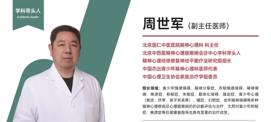 北京国仁中医医院精神心理科 科主任周世军主任长期从事精神心理疾病的临床诊治与研究近40余年,深耕精神疾病领域,积累深厚的理论基础与实战经验。毕业于上海第二军医大学,作为北京中西医精神心理疑难病会诊中心学科带头人、精神心理经络修复神经平衡疗法研究组组长、中国杰出青少年精神心理科医师代表、中国心理卫生协会家庭治疗学组委员,为全国无数心理疾病患者驱散了阴霾,重获了光明与希望。