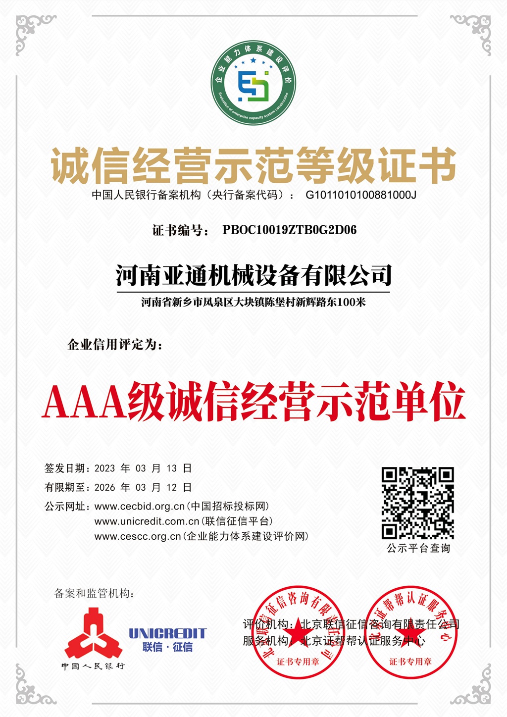 权威认证:河南亚通机械设备有限公司是国家高新技术企业、国家科技型中小企业、河南省创新型中小企业、振动协会副会长单位、AAA级信用企业、振动协会推荐品牌、全国振动行业产教融合共同体理事长单位、新乡市振动工程学会会长单位,产品通过ISO9001质量管理体系认证。