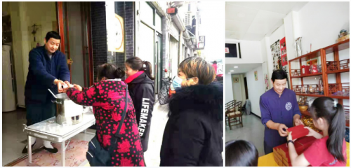 诚信之外,他更怀赤子之心反馈社会。他深谙“一阴一阳之谓道”——有所得,必有所施。疫情前,每年腊八节,他亲自组织熬制腊八粥,赠予社区居民与路人,传递节日温情;疫情期间,他配制含艾草、苍术等中草药的防疫香囊,免费发放,借助香薰之力助人驱疫避秽;重阳节,则向社区老人和路人赠送“寿米”,寓意长寿安康。这些公益活动,非为宣传造势,而是发自内心的责任感。他常说:“我们取之于社会,理应反哺之。”