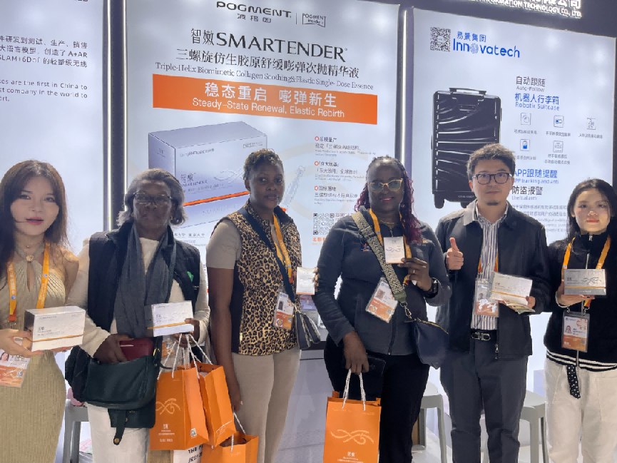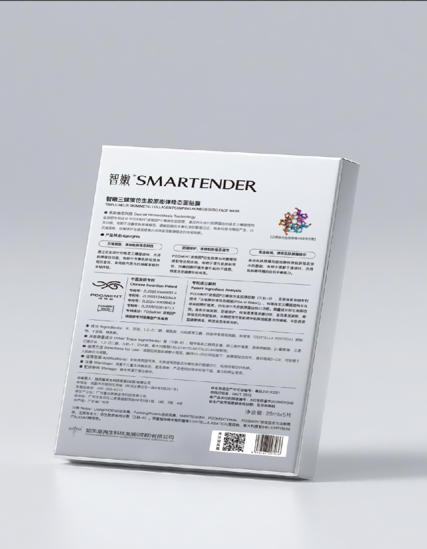 智嫩®「嘭弹棒」,是如凤凰团队历经上千个日夜潜心研发,将POGMENT波格因®三螺旋仿生胶原蛋白实现从基础研究-应用研究-产业化转化的第一个产品,也是在今年中国国际进口博览会四川馆全球首发的核心产品。其核心功效,在于通过核心成分波格因,缓解因皮肤稳态失衡引发的细纹皱纹、弹性下降和敏感泛红等问题。而波格因,就是我们研发的继动物提取和基因重组之后的新一代仿生胶原再生生命材料。