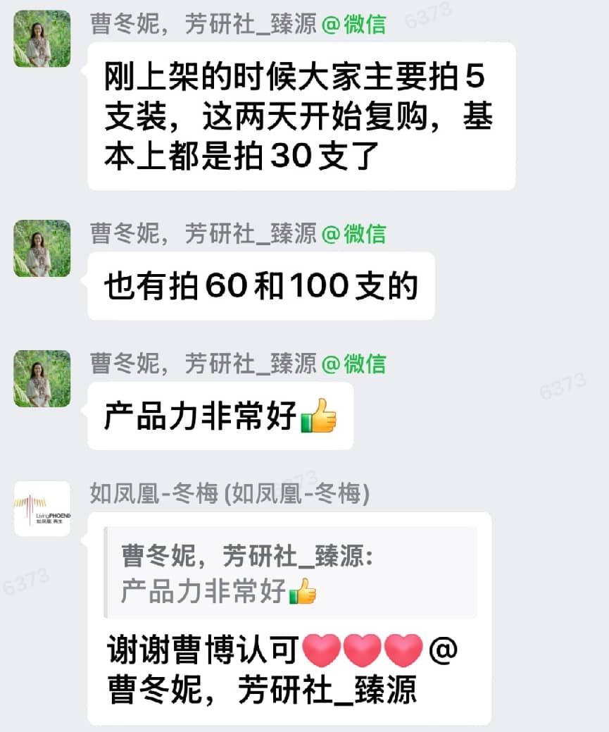 中午,新加坡国立大学(NUS)生物学的曹芳妮博士(“芳研社”创始人)急询智嫩®「嘭弹棒」库存,准备直播推荐。11月3日在广州吃饭时,请邓伟建同学带给曹博士的5支装体验装效果惊艳,第二天一早就发来感谢,并下单270盒!